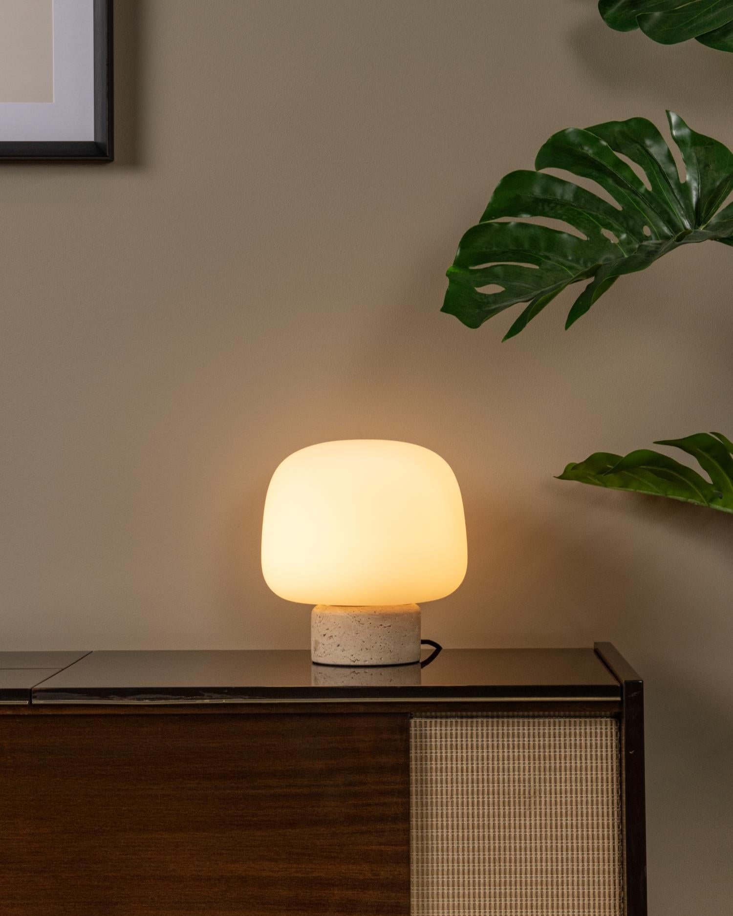 Geef je bijzettafel of buffetkast een eigentijdse toets met Anston, een tafellamp uit opaal glas die rust op een brede, travertin marmeren voet. De bolvormige ijsmatte lamp verspreidt een diffuus licht die je kamer een serene sfeer geeft. Ideaal voor een wachtkamer of praktijkruimte, maar even goed kies je voor Anston in je woonkamer of op je nachtkastje. Vervaardigd uit hoogwaardig glas is deze tafellamp een uitstekende keuze wanneer je voor een hedendaagse, organische stijl wil gaan. Je klikt het licht eenvoudig aan en uit met de schakelaar op het snoer.
