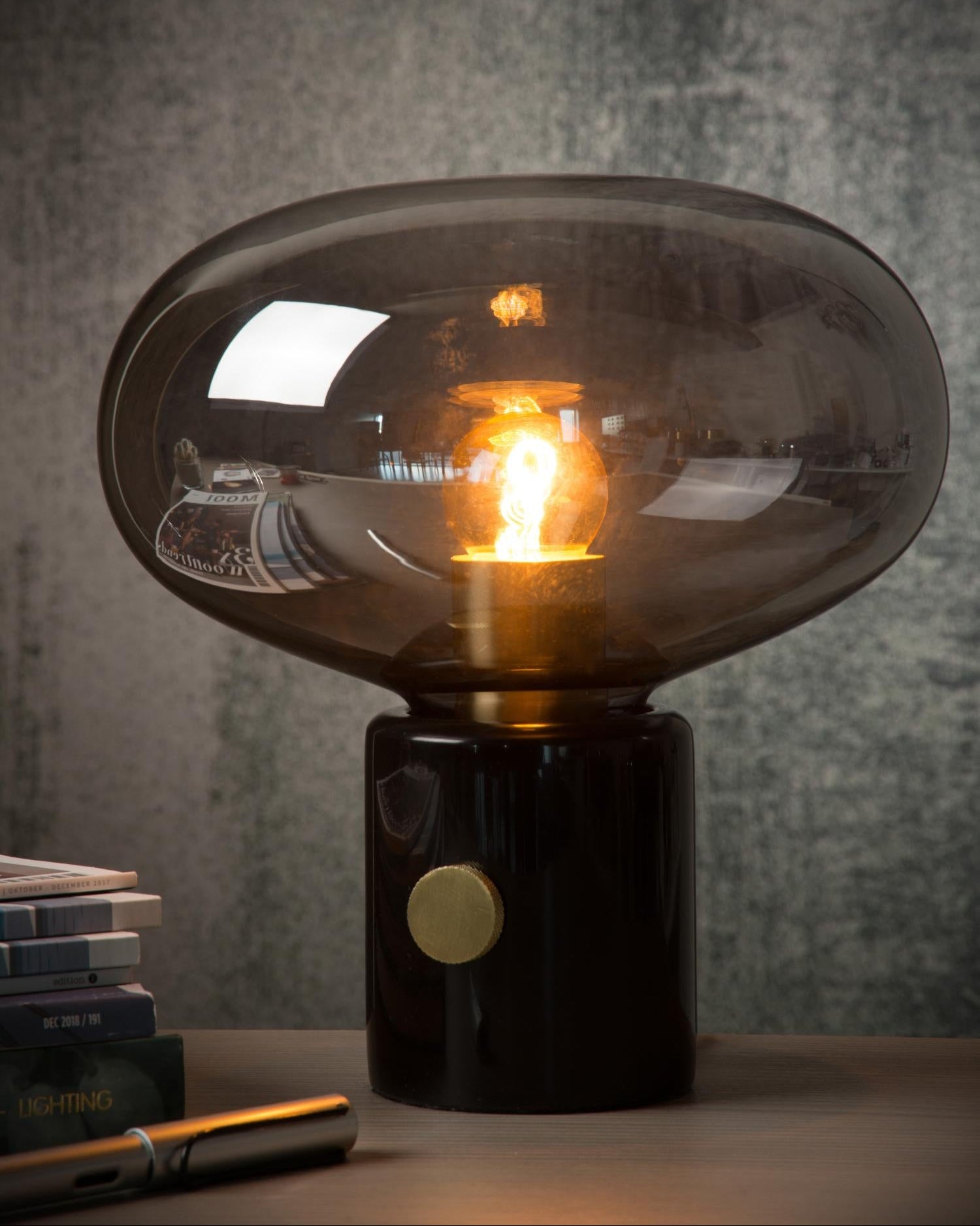 Charlize, een elegante en tijdloze naam voor deze dito tafellamp. De combinatie van een hoogwaardig marmeren voet met amber of smoke glaswerk als kap maakt van Charlize een uniek retrostuk in ieder interieur. Met een geschikte ledlamp brengt ze warmte en gezelligheid in de woonkamer, eetkamer of slaapkamer. De ronde tafellamp met een diameter van 23 centimeter zet je eenvoudig aan en uit met een schakelaar verwerkt in het snoer.