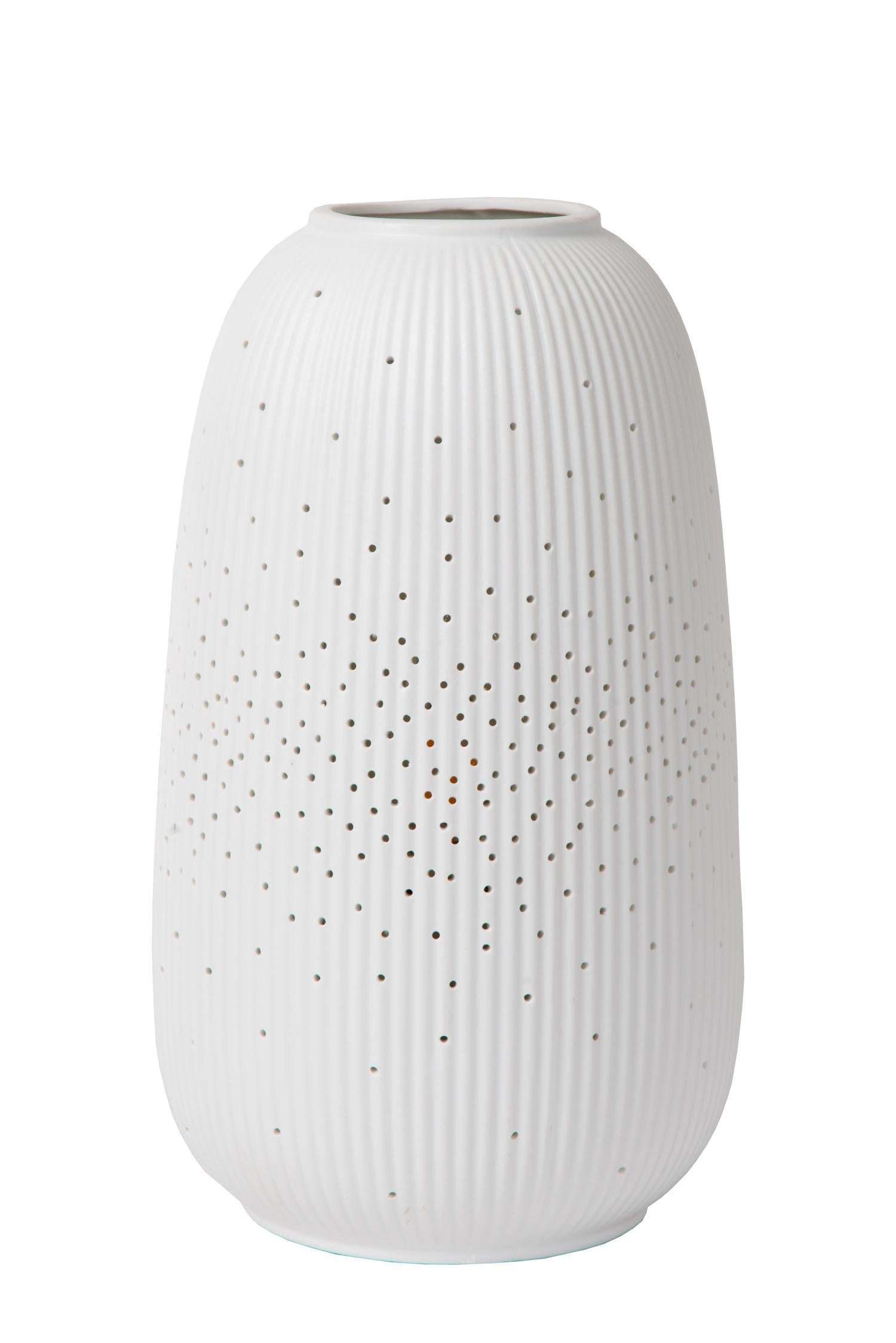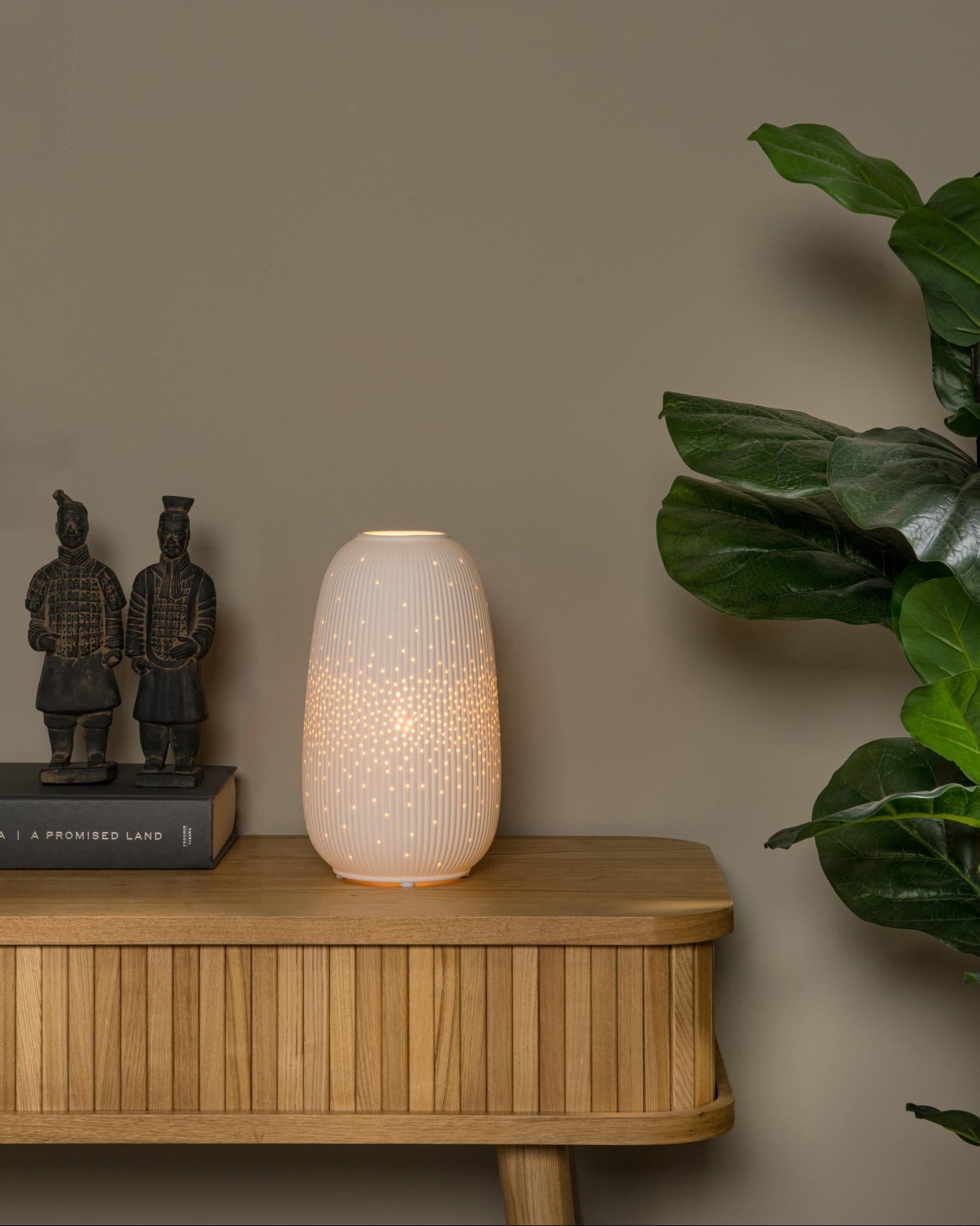 Verras je huisgenoten en gasten met deze originele lamp met de looks van een luxueuze vaas. Flores straalt door zijn eenvoud en elegantie. Met zijn langgerekte vorm is deze porseleinen tafellamp een sierlijke verschijning op zowel je salontafel, commode als bijzettafeltje. Knip Flores aan via de schakelaar op het snoer en het lijkt alsof de schemerlamp een kleurrijk kleed aantrekt. Door de fijne ronde openingen in de armatuur ontsnapt het licht op een speelse manier. Flores is ongeveer 24 centimeter hoog en 14 centimeter breed en is geschikt voor een ledlichtbron.