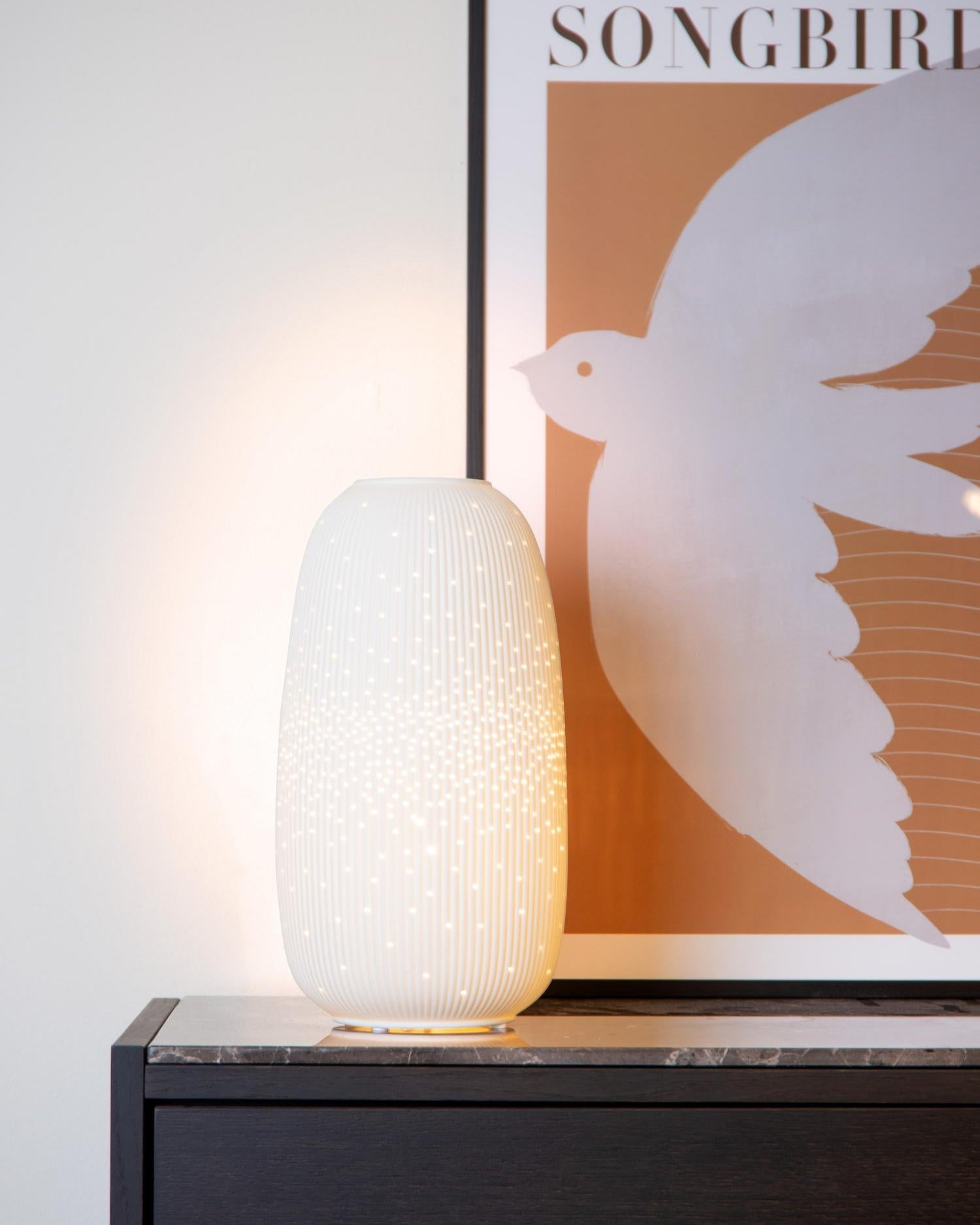 Met deze originele tafellamp voeg je een leuk retro accessoire aan je interieur toe. Van Flores geniet je zowel met de lichtbron aan als uit. Deze tafelverlichting uit porselein is sierlijk elegant door haar langgerekte vorm. Via verspreide openingen in de armatuur verlicht de lamp elke ruimte op speelse wijze. Op je vensterbank, commode, nachtkastje of salontafel komt Flores perfect tot zijn recht. Knip de lamp aan of uit via een schakelaar op het snoer. Met bijna 18 centimeter breedte en iets meer dan 33 centimeter hoogte is Flores geen kleintje. De lamp is compatibel met een ledlichtbron.