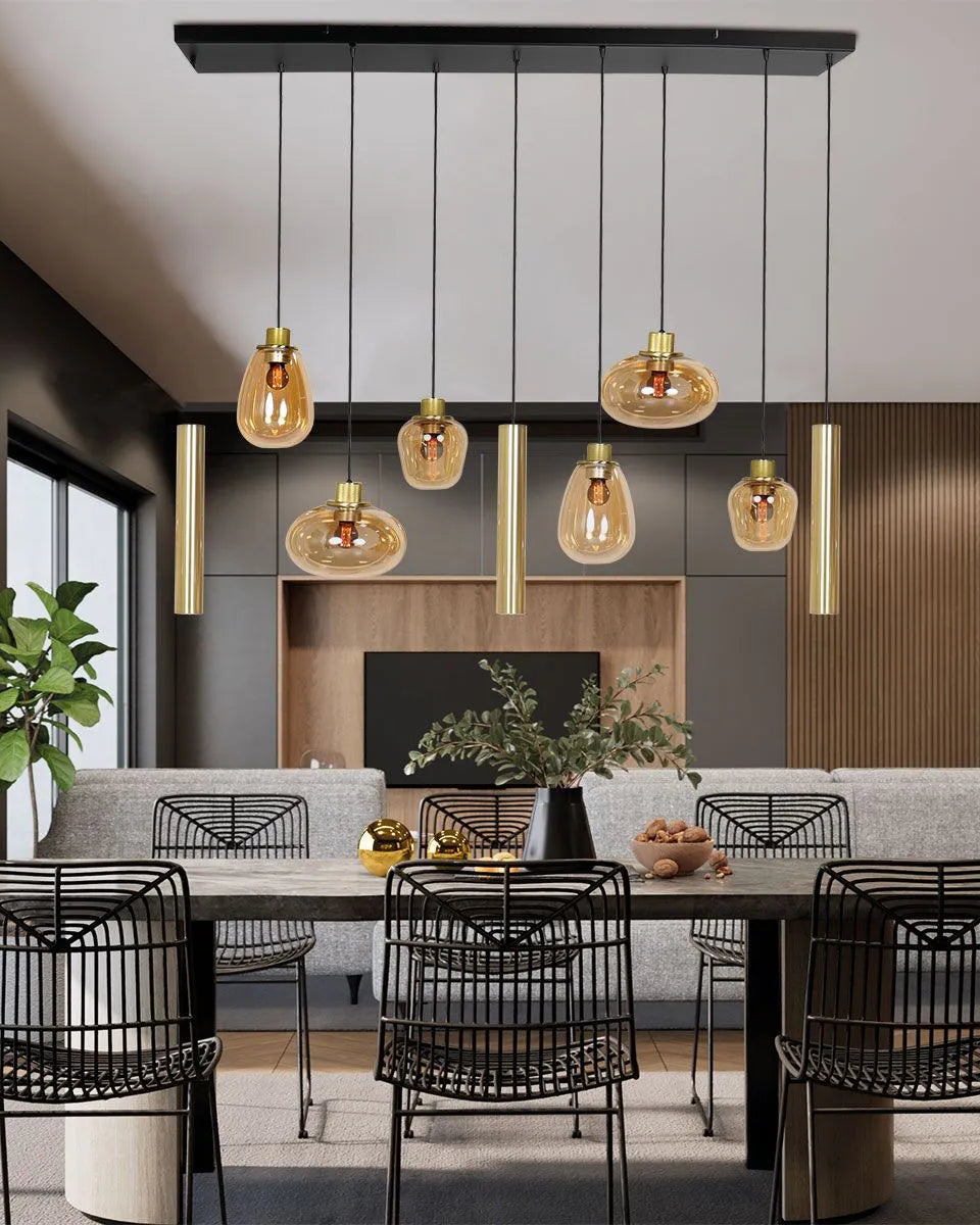 De 6 amberkleurige glazen bollen, voorzien van E27 fittingen, verspreiden een warme gloed, terwijl de 3 kokers met GU10 fittingen zorgen voor direct licht op de tafel.
