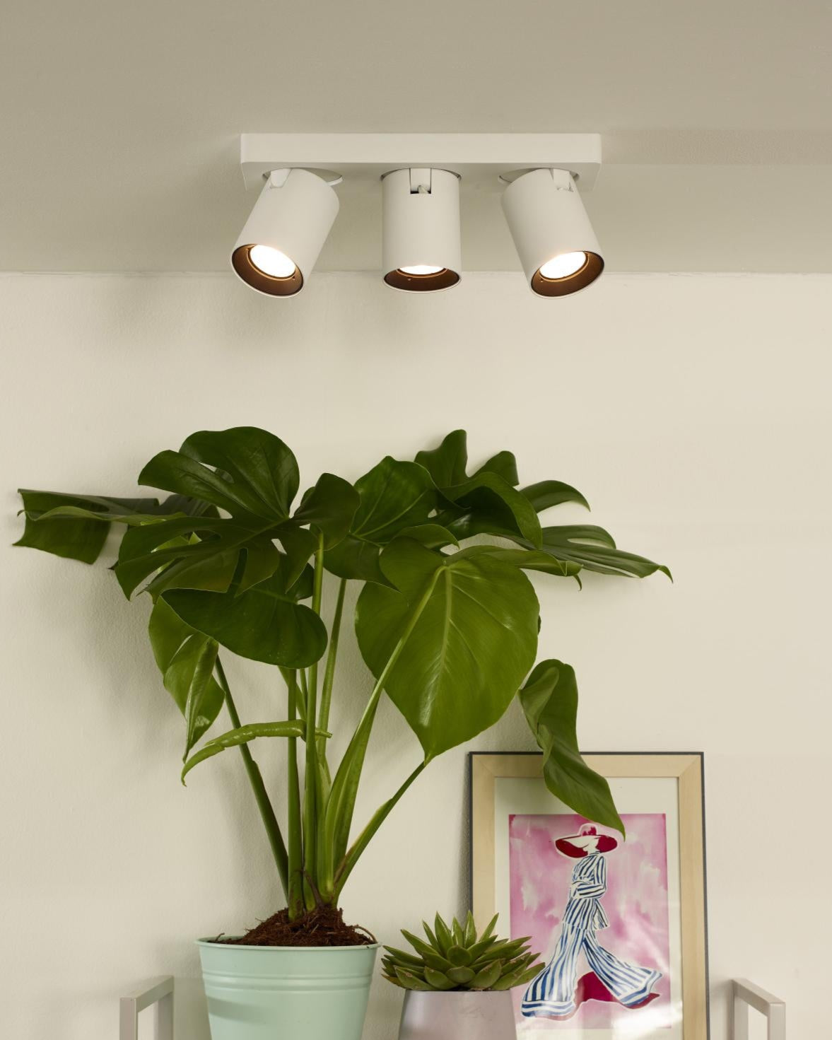Dit is Nigel, een plafondspot compatibel met drie GU10 dim to warm ledlichtbronnen. Deze geven licht van 2200 tot 3000k. Een eenvoudig en tijdloos ontwerp met een cilindervormige lampenkap zodat de spot zich in allerlei interieurstijlen thuis voelt. Nigel is zowel in het zwart als wit beschikbaar. En met verschillende lichtpunten. De witte variant kreeg een zwarte kleur aan de binnenzijde van het armatuur. De plafondspot is gemaakt uit aluminium en is 12 centimeter hoog. Bevestig Nigel aan het plafond, sluit aan op een compatibele dimmer, draai en kantel de spots naar keuze en geniet.